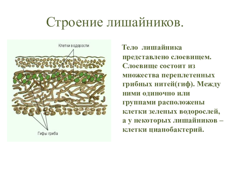 симбиоз, слоевище(таллом), кустистые, листовые, накипные.