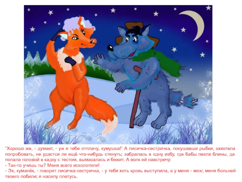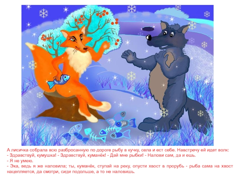 - Эка, ведь я же наловила; ты, куманёк, ступай на реку, опусти хвост в прорубь - рыба сама на хвост нацепляется, да смотри, сиди подольше, а то не наловишь.