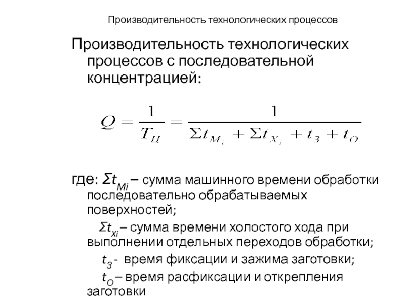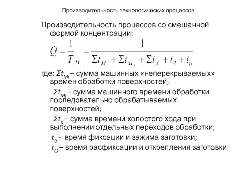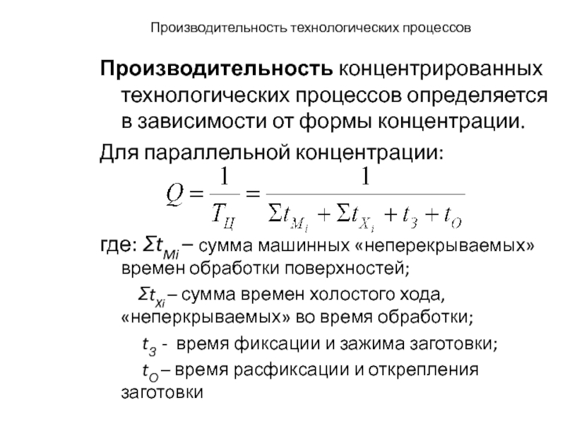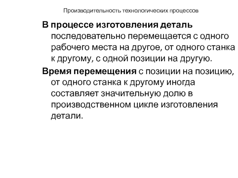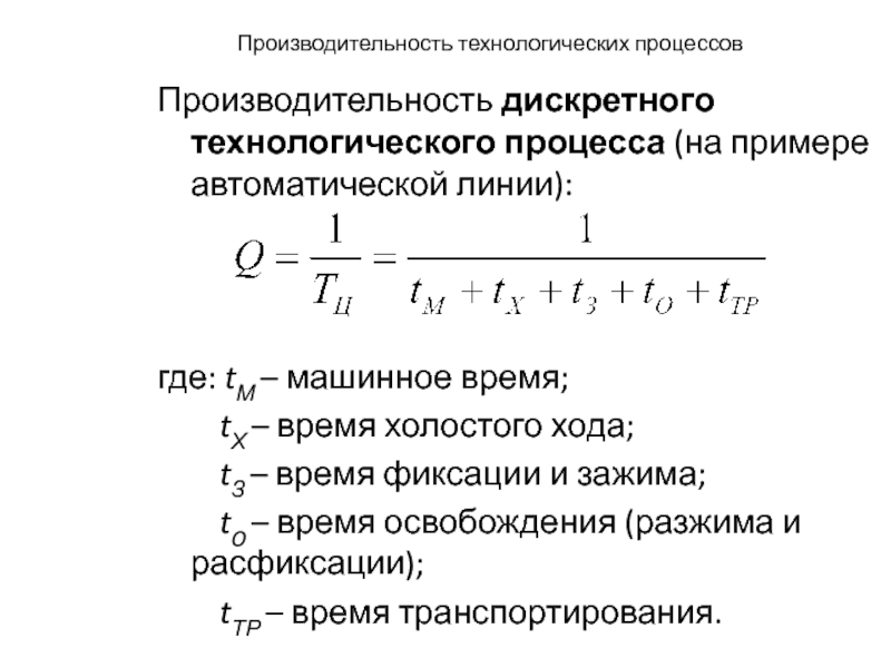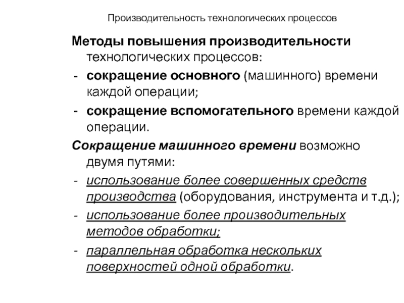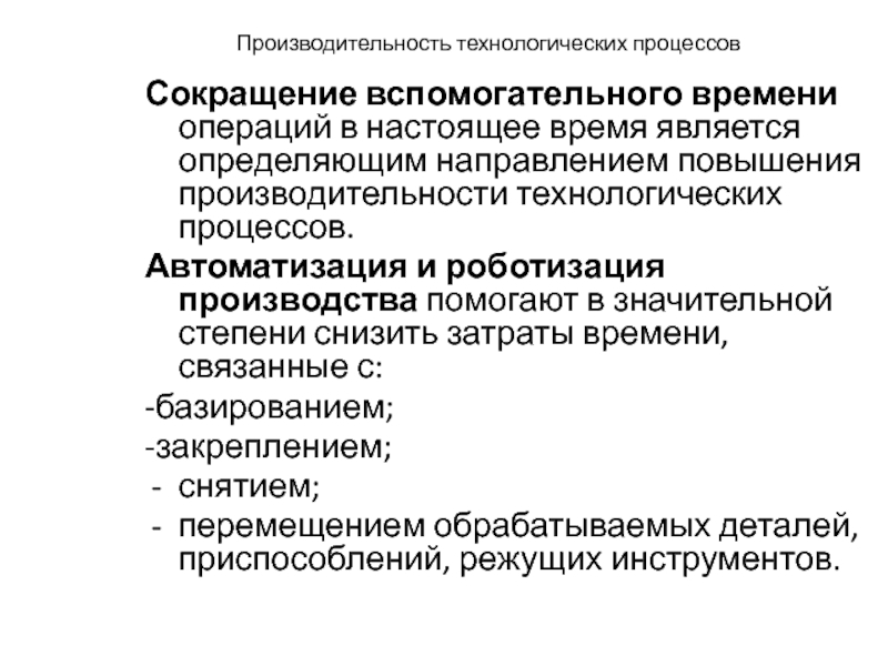 Производительно затраченными считается только то время, которое расходуется на основные технологические процессы (формообразование, контроль, сборку). Все остальное время, включая время на вспомогательные (холостые) ходы рабочего цикла и внецикловые простои, является непроизводительно затраченным. Это время относят к потерям