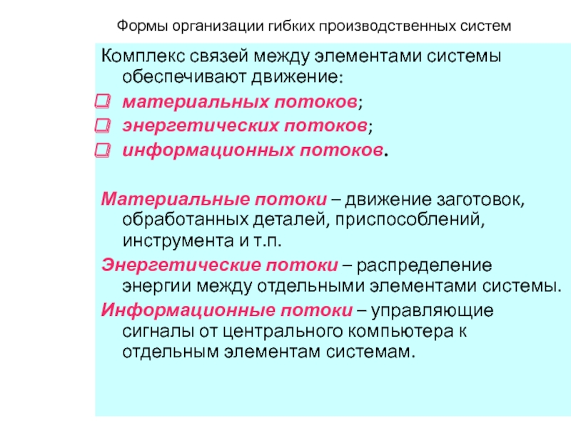 Информационные потоки – управляющие сигналы от центрального компьютера к отдельным элементам системам.