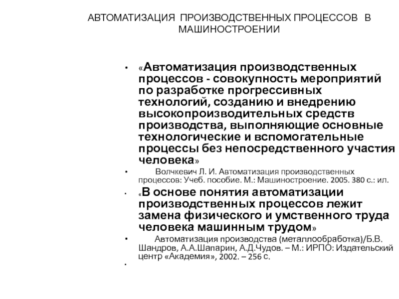 Волчкевич Л. И. Автоматизация производственных процессов: Учеб. пособие. М.: Машиностроение. 2005. 380 с.: ил.