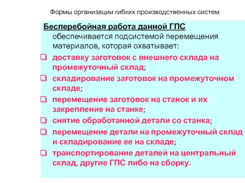 транспортирование деталей на центральный склад, другие ГПС либо на сборку.
