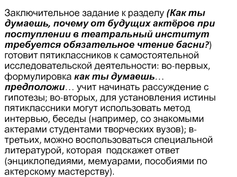 готовит пятиклассников к самостоятельной исследовательской деятельности: во-первых, формулировка как ты думаешь… предположи… учит начинать рассуждение с гипотезы; во-вторых, для установления истины пятиклассники могут использовать метод интервью, беседы (например, со знакомыми актерами студентами творческих вузов); в-третьих, можно воспользоваться специальной литературой, которая подскажет ответ (энциклопедиями, мемуарами, пособиями по актерскому мастерству).