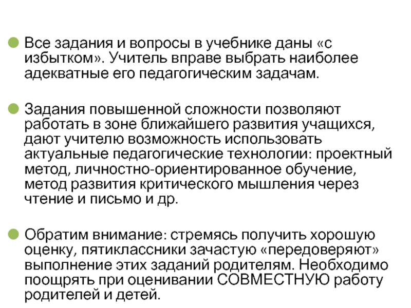 Впервые после этой сказки встречается задание «Проведи самостоятельное исследование» (стр. 59). Это задание адресовано не всем учащимся. Положительную оценку ученик получает только в случае именно самостоятельного выполнения . Можно организовать групповую работу по выполнению этого задания.