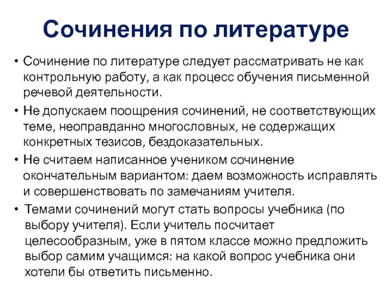 поощрения сочинений, не соответствующих теме, неоправданно многословных, не содержащих конкретных тезисов, бездоказательных.