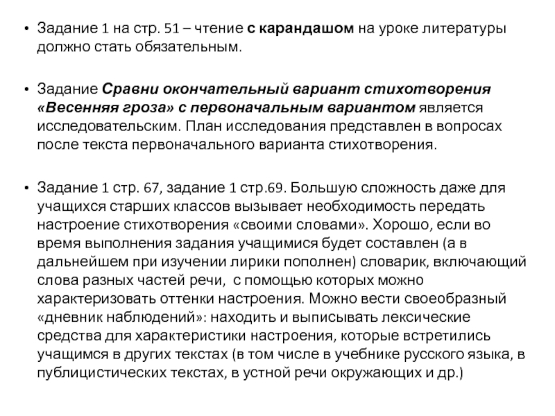 «Весенняя гроза» с первоначальным вариантом является исследовательским. План исследования представлен в вопросах после текста первоначального варианта стихотворения.