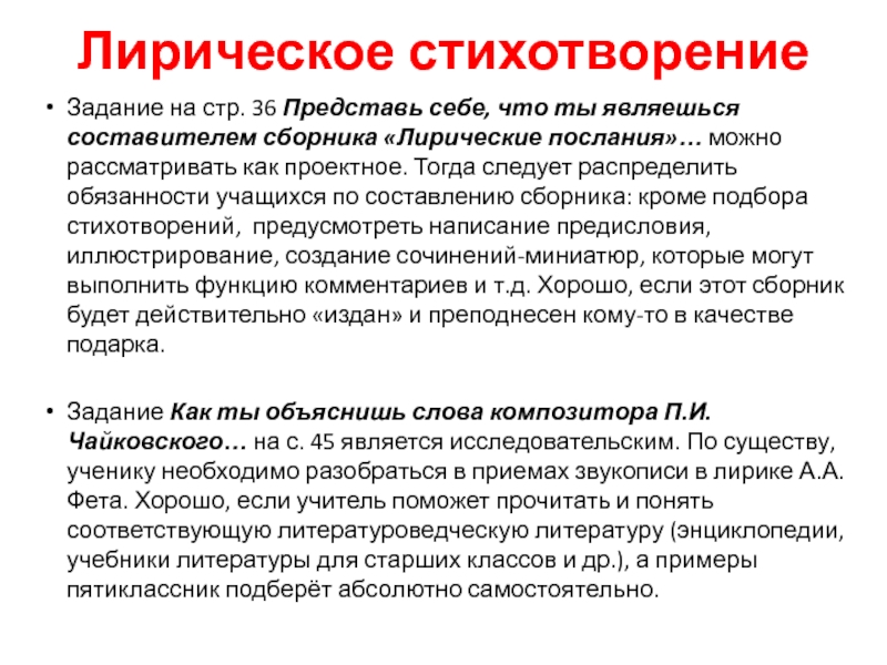 Задание Как ты объяснишь слова композитора П.И. Чайковского… на с. 45 является исследовательским. По существу, ученику необходимо разобраться в приемах звукописи в лирике А.А. Фета. Хорошо, если учитель поможет прочитать и понять соответствующую литературоведческую литературу (энциклопедии, учебники литературы для старших классов и др.), а примеры пятиклассник подберёт абсолютно самостоятельно.