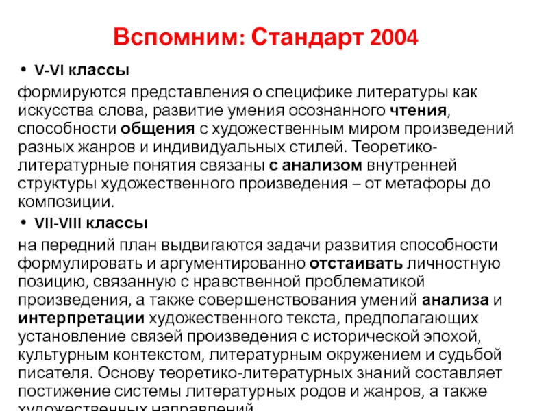 на передний план выдвигаются задачи развития способности формулировать и аргументированно отстаивать личностную позицию, связанную с нравственной проблематикой произведения, а также совершенствования умений анализа и интерпретации художественного текста, предполагающих установление связей произведения с исторической эпохой, культурным контекстом, литературным окружением и судьбой писателя. Основу теоретико-литературных знаний составляет постижение системы литературных родов и жанров, а также художественных направлений.