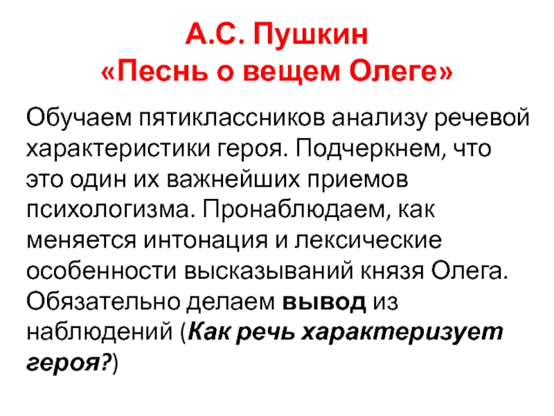 Пронаблюдаем, как меняется интонация и лексические особенности высказываний князя Олега. Обязательно делаем вывод из наблюдений (Как речь характеризует героя?)
