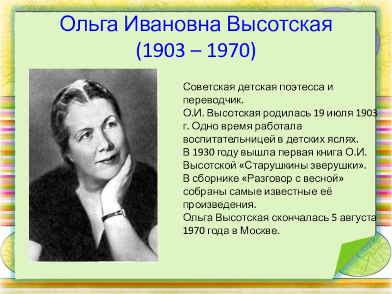 Ольга Ивановна Высотская (1903 – 1970)Советская детская поэтесса и переводчик.О.И. Высотская родилась 19 июля 1903 г. Одно