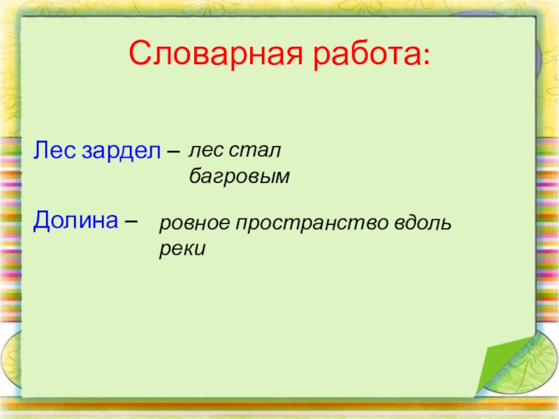 Словарная работа:Лес зардел – Долина – лес стал багровымровное пространство вдоль реки