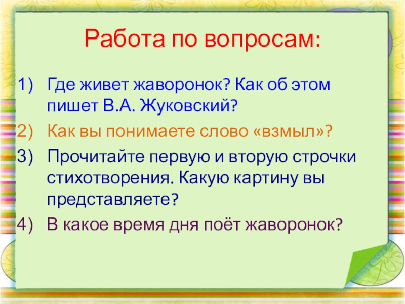 Работа по вопросам:Где живет жаворонок? Как об этом пишет В.А. Жуковский?Как вы понимаете слово «взмыл»?Прочитайте первую и