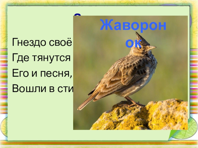 ЗагадкаГнездо своё он в поле вьёт, Где тянутся растения.Его и песня, и полётВошли в стихотворения.Жаворонок