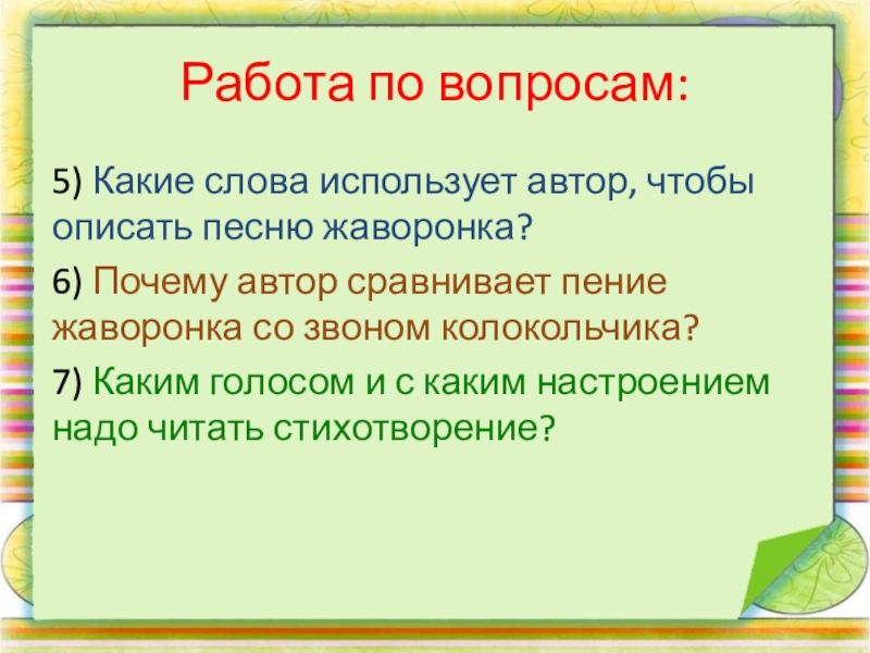 Работа по вопросам:5) Какие слова использует автор, чтобы описать песню жаворонка?6) Почему автор сравнивает пение жаворонка со