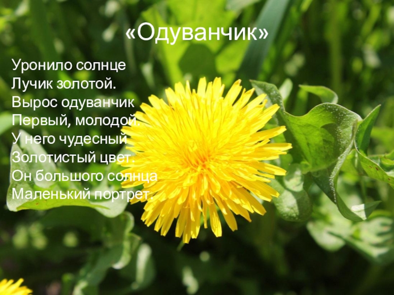 «Одуванчик»Уронило солнцеЛучик золотой.Вырос одуванчикПервый, молодой.У него чудесныйЗолотистый цвет.Он большого солнцаМаленький портрет.