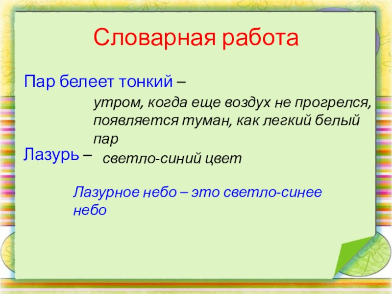 Словарная работаПар белеет тонкий –Лазурь – утром, когда еще воздух не прогрелся, появляется туман, как легкий белый