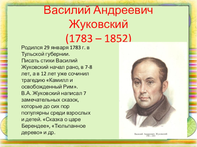 Василий Андреевич  Жуковский  (1783 – 1852)Родился 29 января 1783 г. в Тульской губернии.Писать стихи Василий