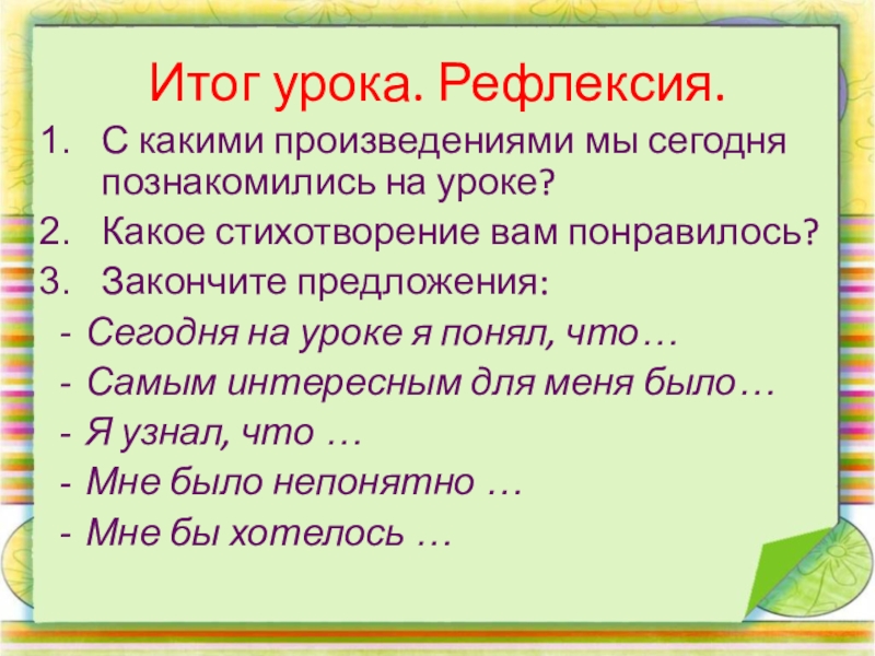 Итог урока. Рефлексия.С какими произведениями мы сегодня познакомились на уроке?Какое стихотворение вам понравилось? Закончите предложения:Сегодня на уроке