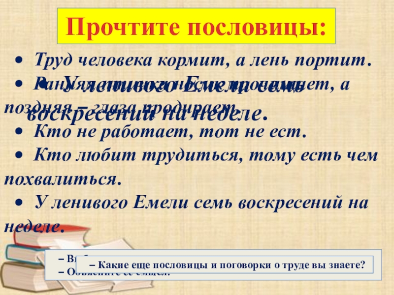 – Какие еще пословицы и поговорки о труде вы знаете?