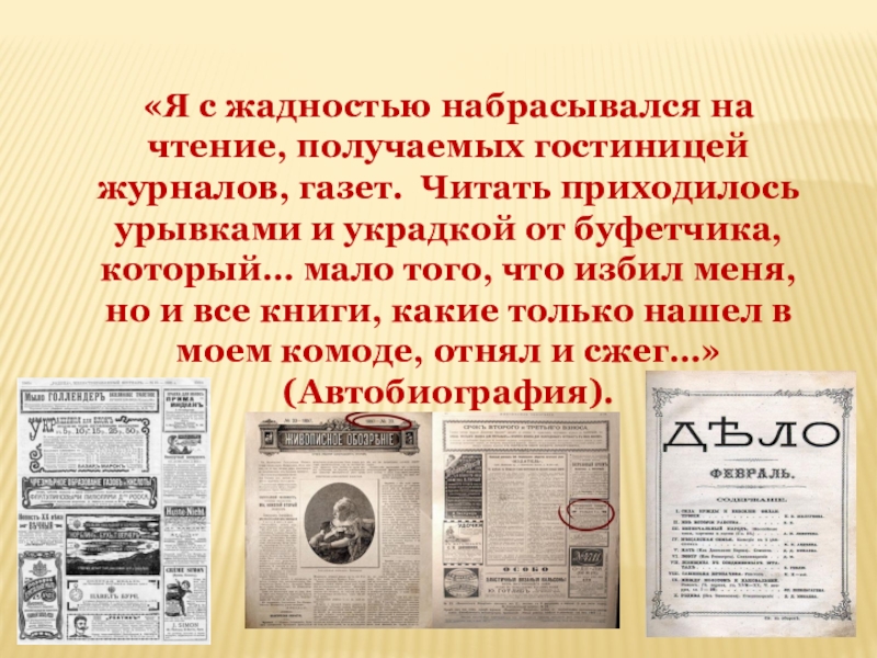 Слайд 13«Я с жадностью набрасывался на чтение, получаемых гостиницей журналов, газет.