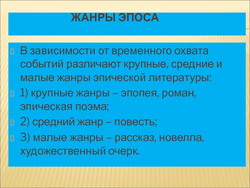 1) крупные жанры – эпопея, роман, эпическая поэма;
