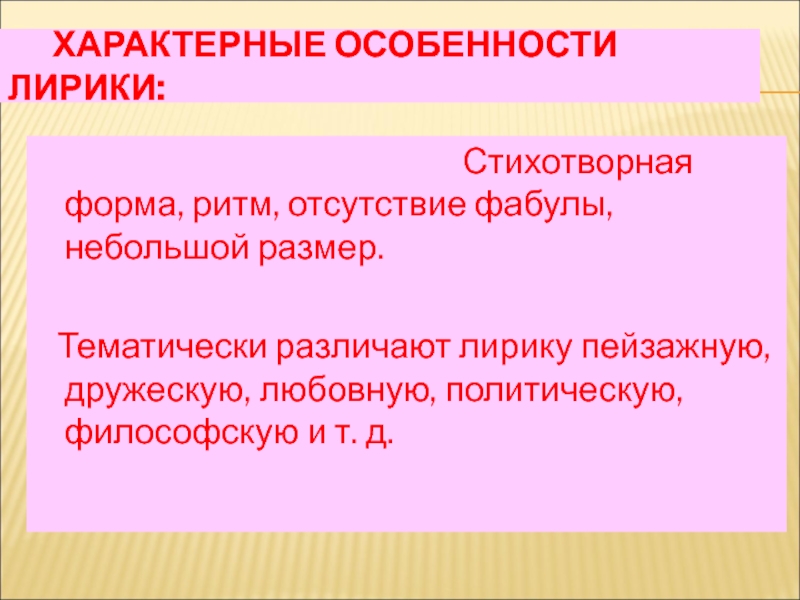 Тематически различают лирику пейзажную, дружескую, любовную, политическую, философскую и т. д.