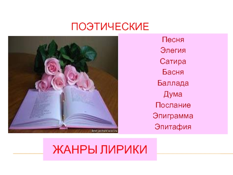 Слайд 4 Лирика – род литературы, отражающий жизнь при помощи изображения отдельных