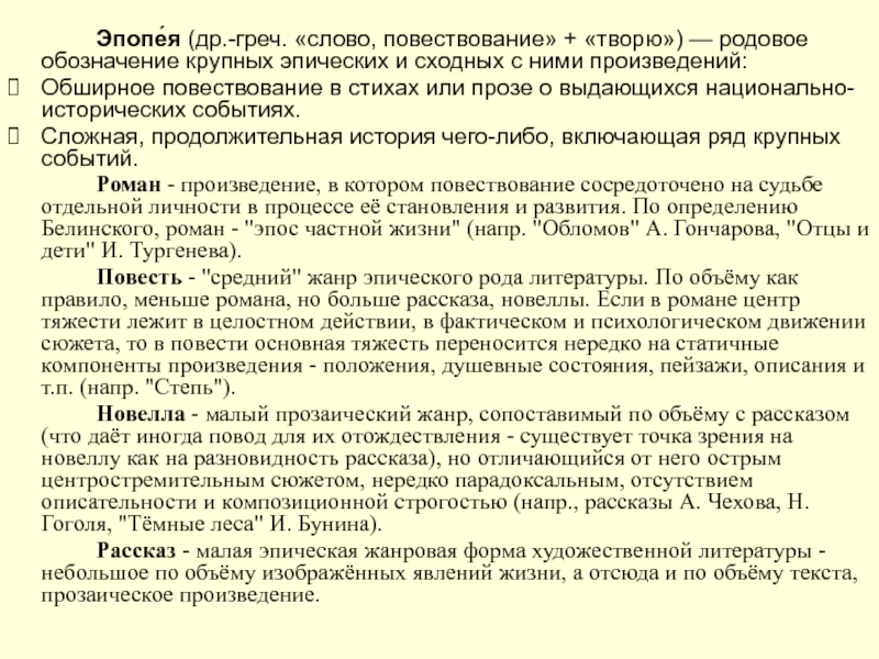 Слайд 14 Эпопе́я (др.-греч. «слово, повествование» + «творю») — родовое обозначение крупных эпических и сходных с ними произведений: