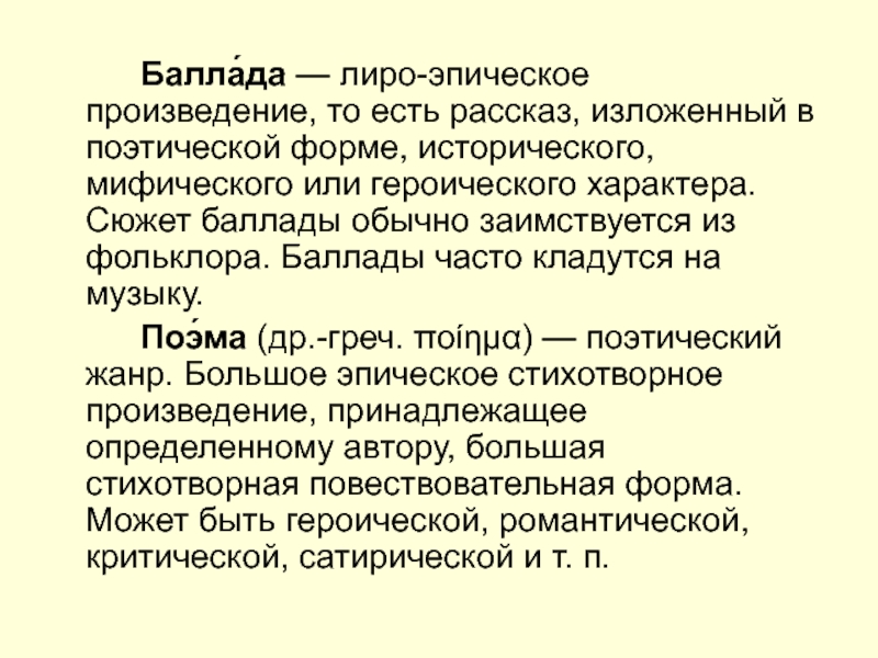 Слайд 24 Балла́да — лиро-эпическое произведение, то есть рассказ, изложенный в поэтической форме,