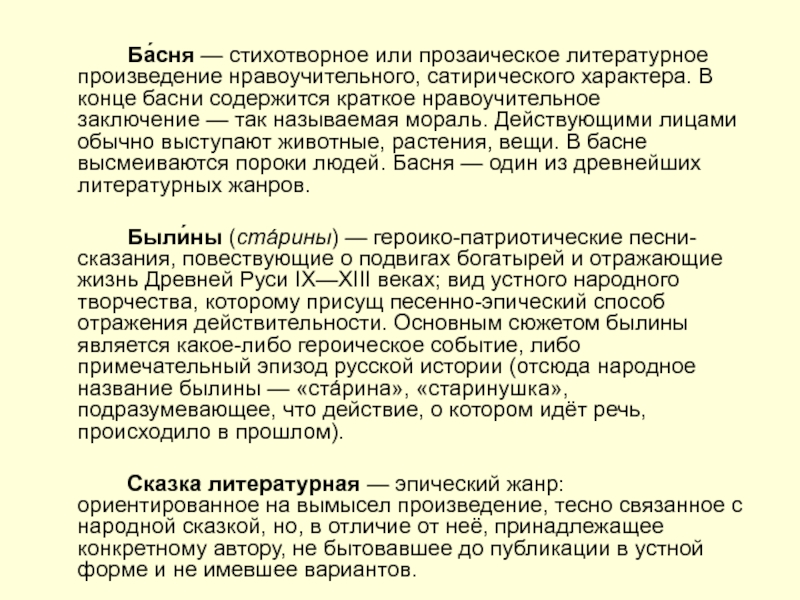 Слайд 15 Ба́сня — стихотворное или прозаическое литературное произведение нравоучительного, сатирического характера. В