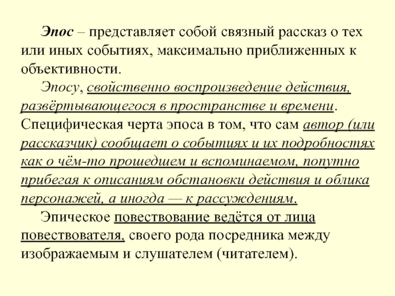 пространстве и времени. Специфическая черта эпоса в том, что сам автор (или рассказчик) сообщает о событиях и их подробностях как о чём-то прошедшем и вспоминаемом, попутно прибегая к описаниям обстановки действия и облика персонажей, а иногда — к рассуждениям.