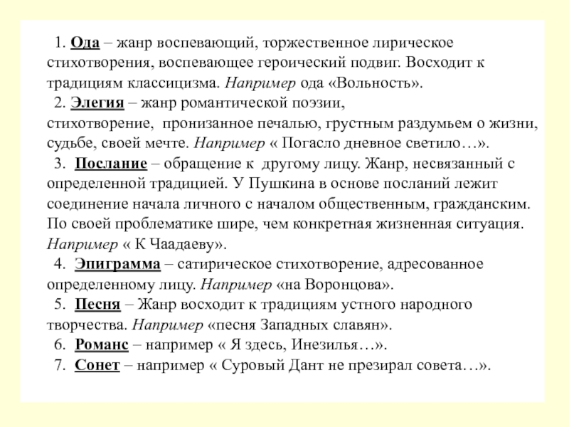 3. Послание – обращение к другому лицу. Жанр, несвязанный с определенной традицией. У Пушкина в основе посланий лежит соединение начала личного с началом общественным, гражданским. По своей проблематике шире, чем конкретная жизненная ситуация. Например « К Чаадаеву».