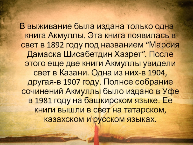 Слайд 17В выживание была издана только одна книга Акмуллы. Эта книга