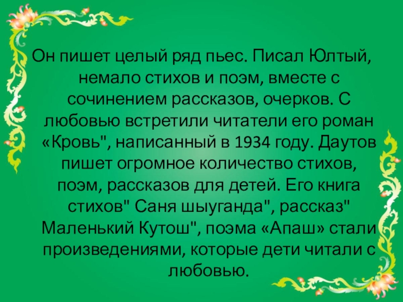 Он пишет целый ряд пьес. Писал Юлтый, немало стихов и