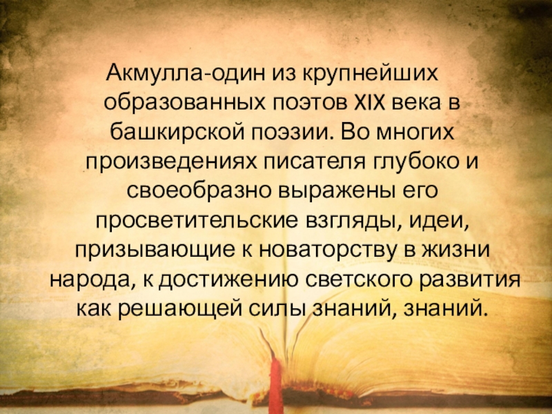 Акмулла-один из крупнейших образованных поэтов XIX века в башкирской поэзии.