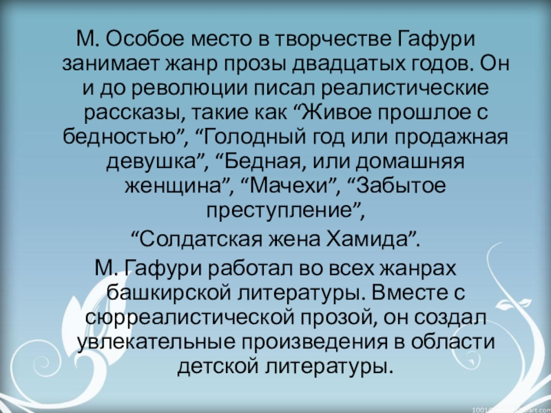 Слайд 8М. Особое место в творчестве Гафури занимает жанр прозы двадцатых