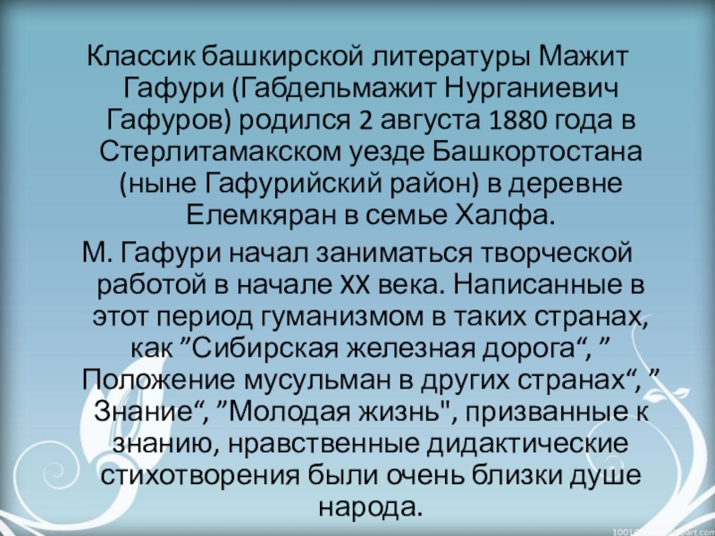 Слайд 6Классик башкирской литературы Мажит Гафури (Габдельмажит Нурганиевич Гафуров) родился 2