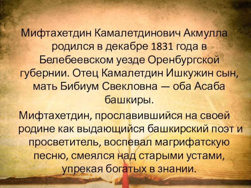 Мифтахетдин Камалетдинович Акмулла родился в декабре 1831 года в Белебеевском