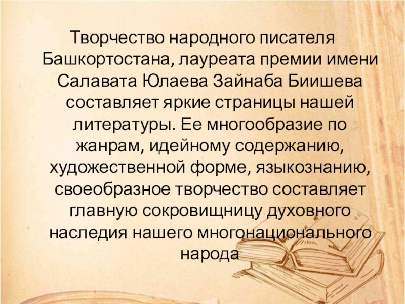 Слайд 3Творчество народного писателя Башкортостана, лауреата премии имени Салавата Юлаева Зайнаба