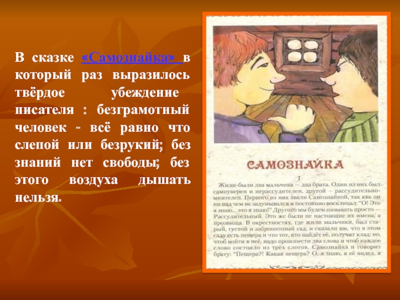 Слайд 13В сказке «Самознайка» в который раз выразилось твёрдое убеждение писателя
