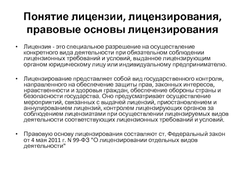 Слайд 2Понятие лицензии, лицензирования, правовые основы лицензирования