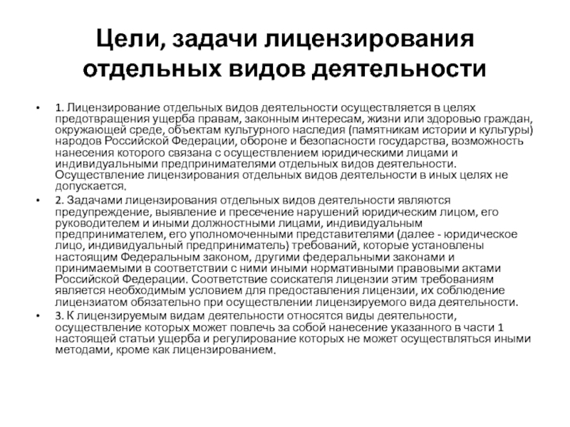 или здоровью граждан, окружающей среде, объектам культурного наследия (памятникам истории и культуры) народов Российской Федерации, обороне и безопасности государства, возможность нанесения которого связана с осуществлением юридическими лицами и индивидуальными предпринимателями отдельных видов деятельности. Осуществление лицензирования отдельных видов деятельности в иных целях не допускается.