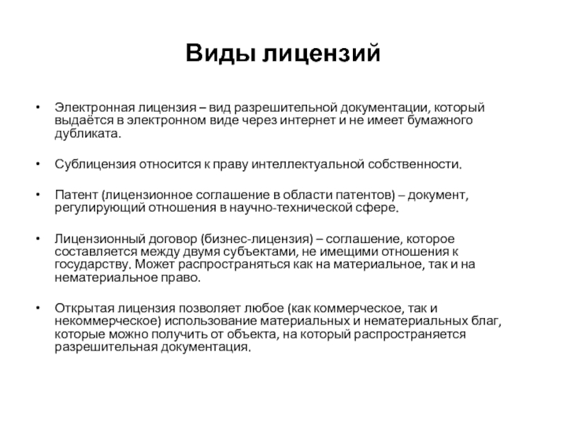 Лицензионный договор (бизнес-лицензия) – соглашение, которое составляется между двумя субъектами, не имещими отношения к государству. Может распространяться как на материальное, так и на нематериальное право.