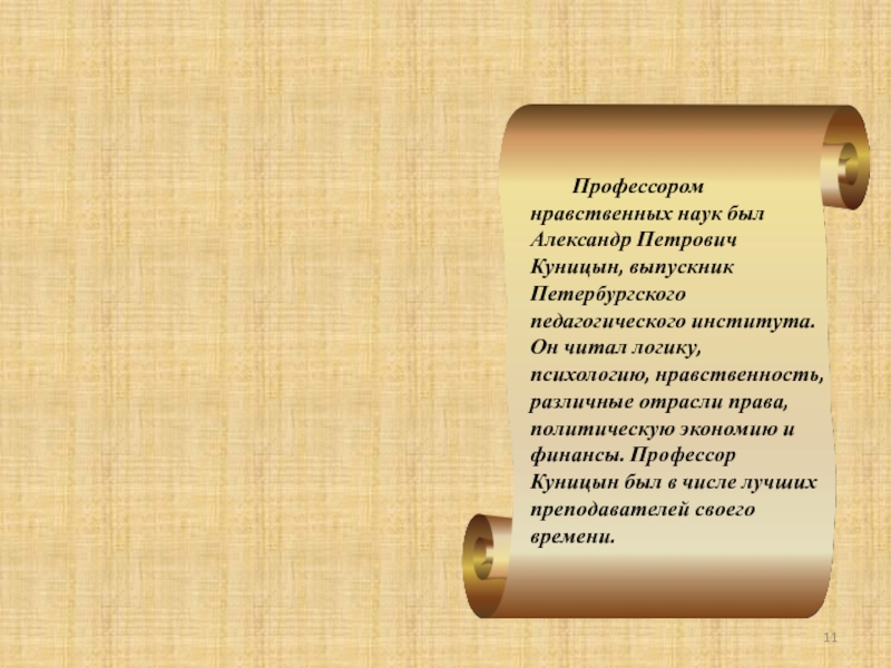 Слайд 11Профессором нравственных наук был Александр Петрович Куницын, выпускник Петербургского педагогического
