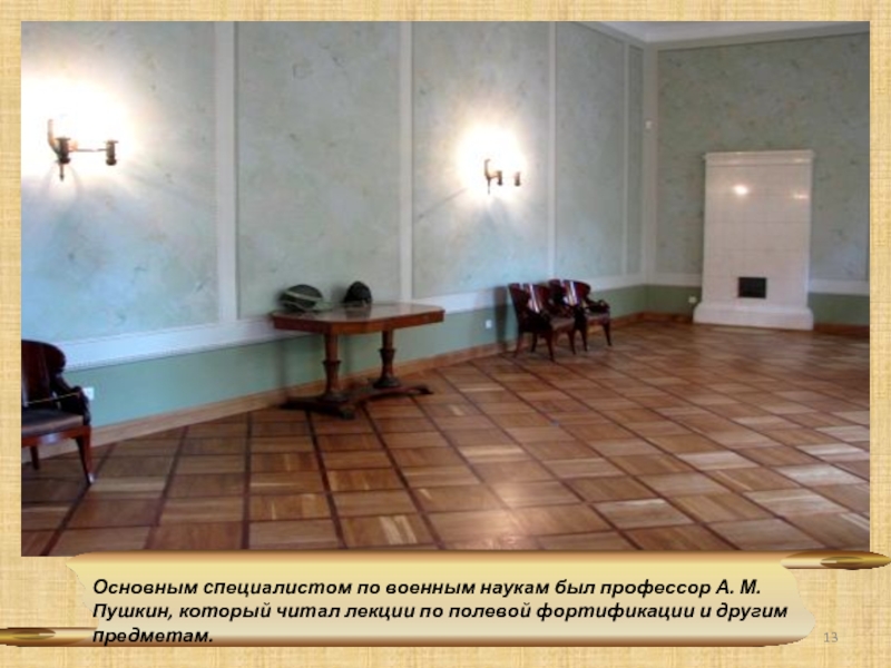 Слайд 13Основным специалистом по военным наукам был профессор А. М. Пушкин,