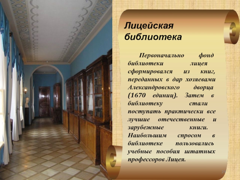 Первоначально фонд библиотеки лицея сформировался из книг, переданных в