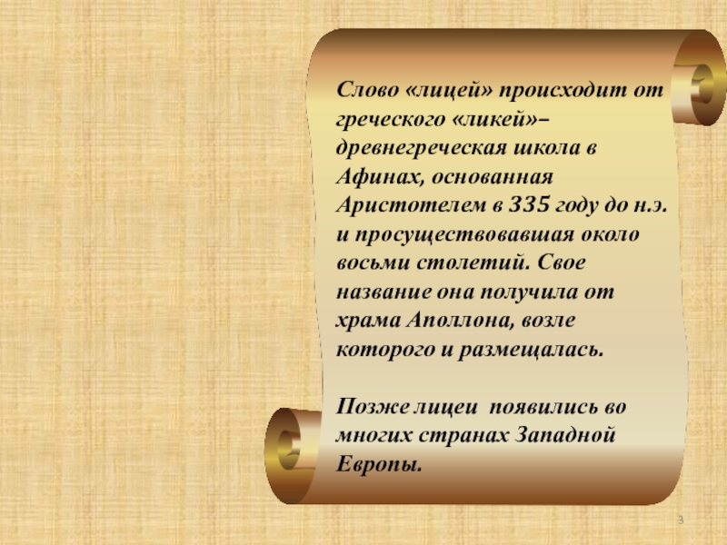 Слово «лицей» происходит от греческого «ликей»– древнегреческая школа в Афинах,
