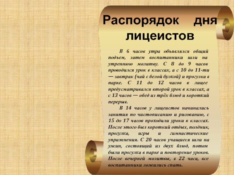 9 часов проводился урок в классах, а с 10 до 11-ти — завтрак (чай с белой булкой) и прогулка в парке. С 11 до 12 часов в лицее предусматривался второй урок в классах, а с 13 часов — обед из трёх блюд и короткий перерыв.