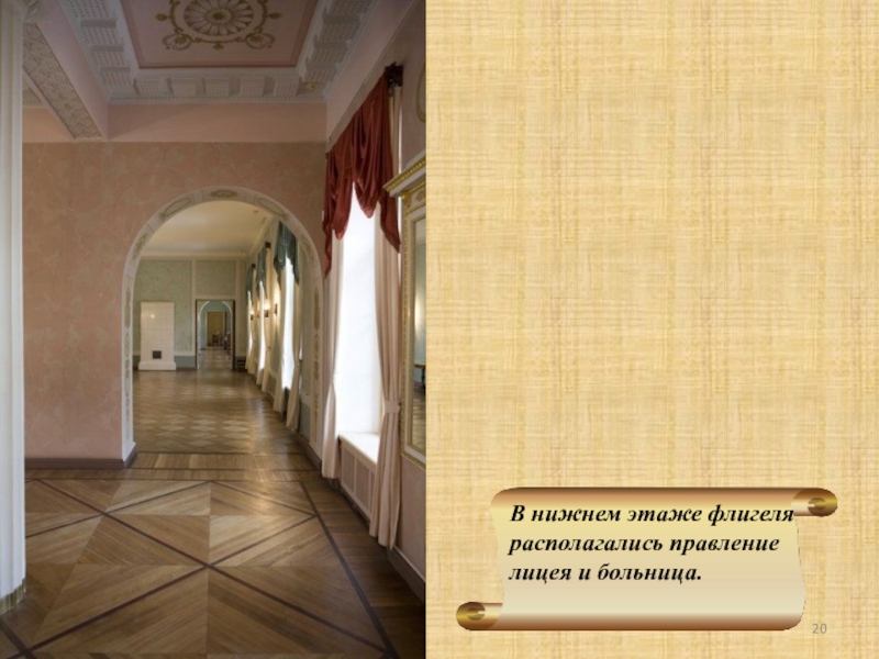 Слайд 20В нижнем этаже флигеля располагались правление лицея и больница.