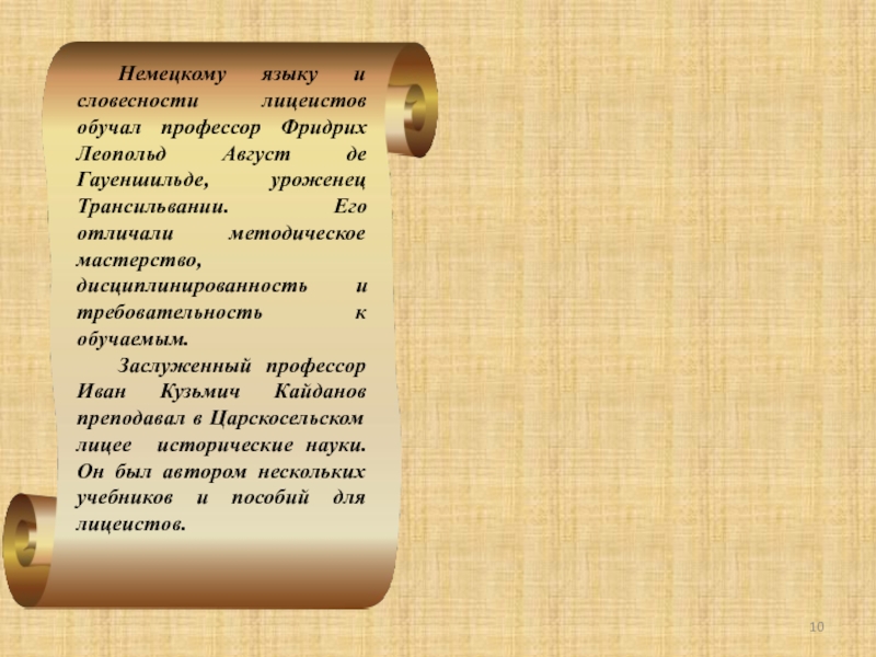 Слайд 10Немецкому языку и словесности лицеистов обучал профессор Фридрих Леопольд Август